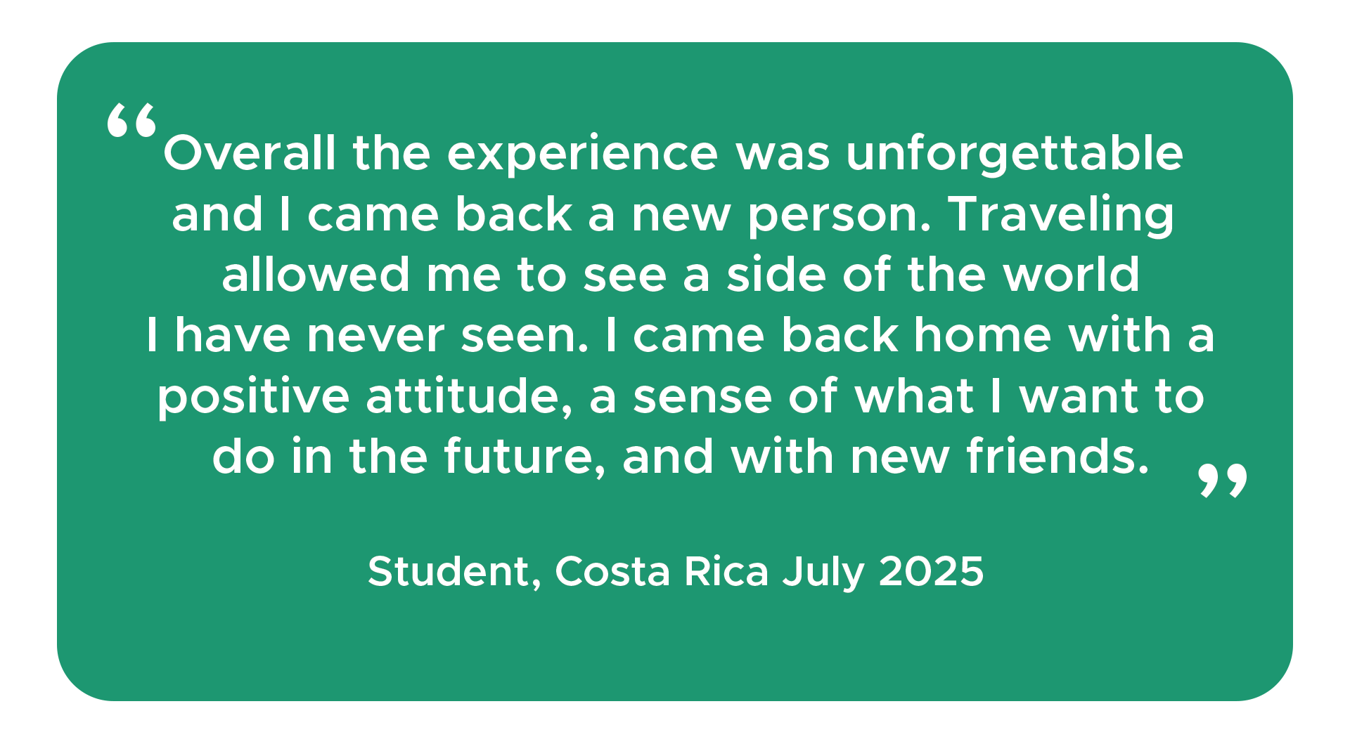 The Monteverde Cloud Forest Reserve has been described as “the jewel in the crown of cloud forests”. Discover this unique area by trekking across walkways built in the forest canopy. This will give you an opportunity to learn about cloud forest ecology and thousands of species. Students will experience a nighttime hike to uncover nocturnal animals that do not reveal themselves during the day.