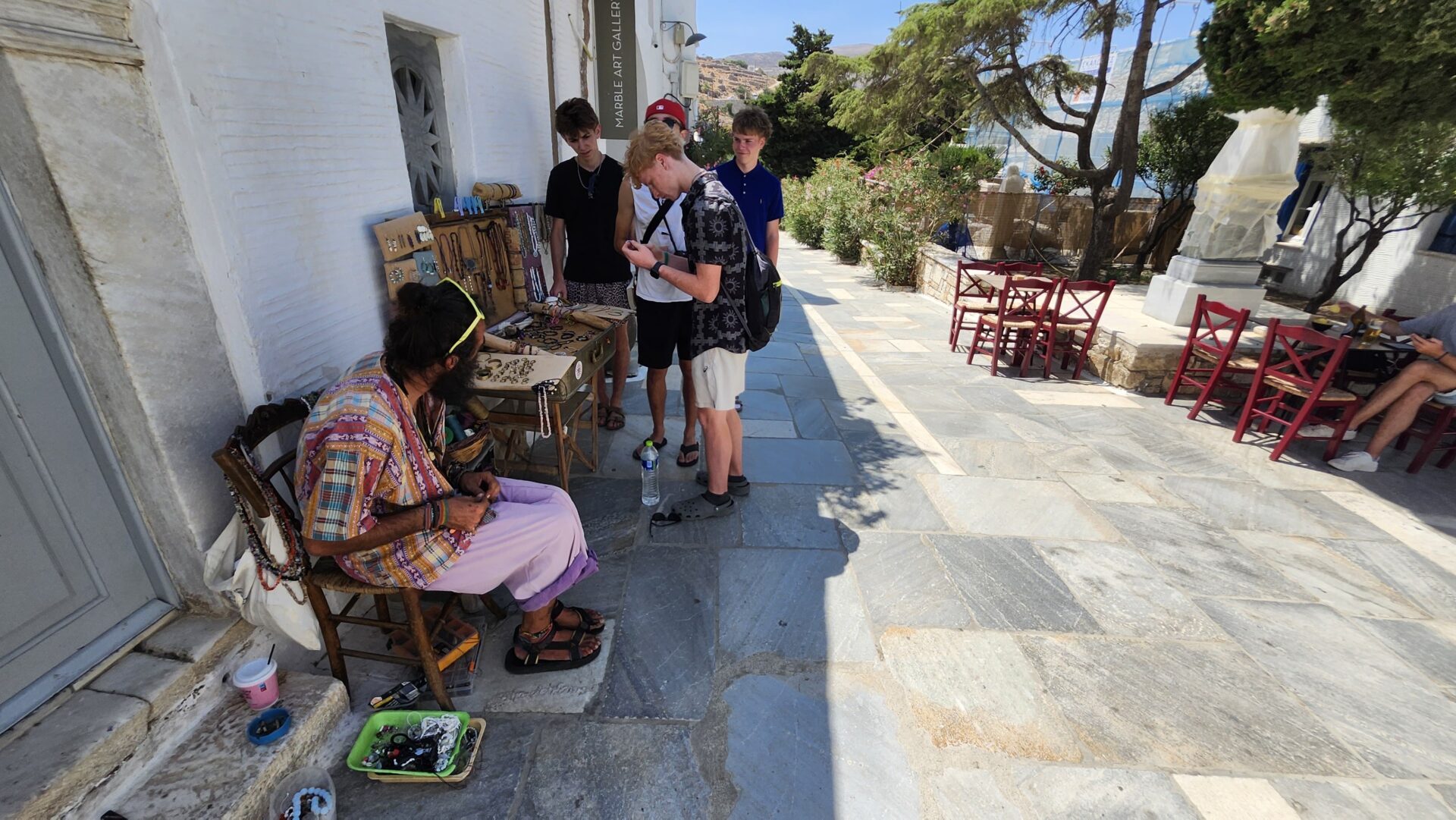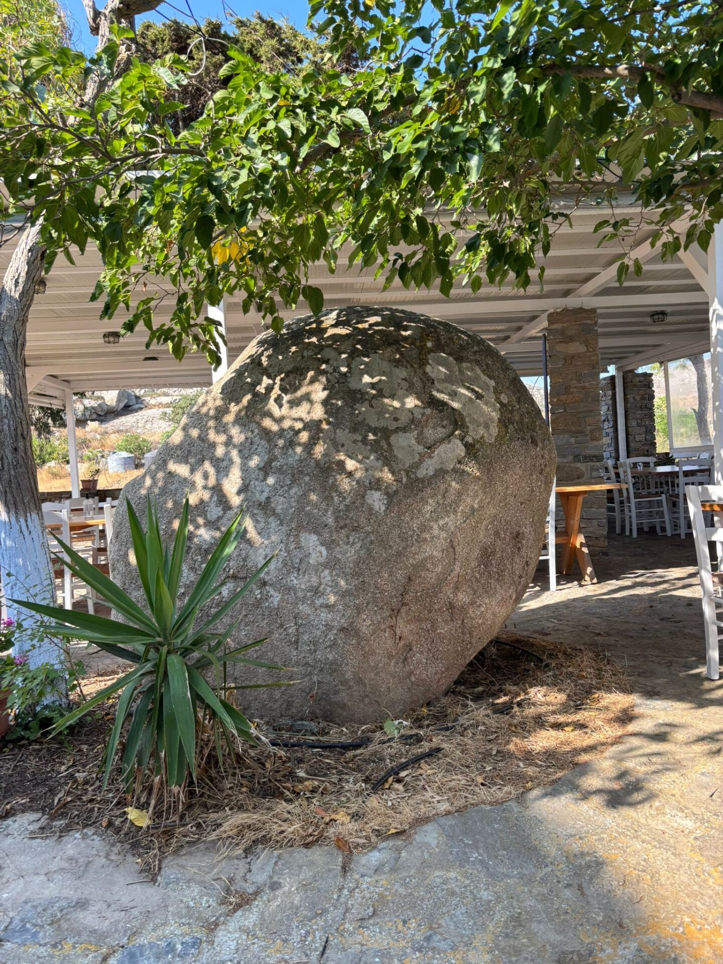 Once we arrived in Pyrgos, we had time to ourselves, dedicated to our schoolwork and exploring the village. It was much more lively than the last, and we found ourselves wandering into the center square, scattered with small cafes and restaurants. All were arranged around a great ancient plane tree, as tall as a crane and as old as the Greek gods themselves, in all its glory. We enjoyed our lunch and then had some time to marvel at the marble statues and pathways, including the fountain in the square, which consisted of common Greek architecture with Doric pillars. Masters of the marble craft come from Tinos and are famous across the nation and around the world, with marble from Tinos in parts of the Louvre and even the Palace of Versailles.