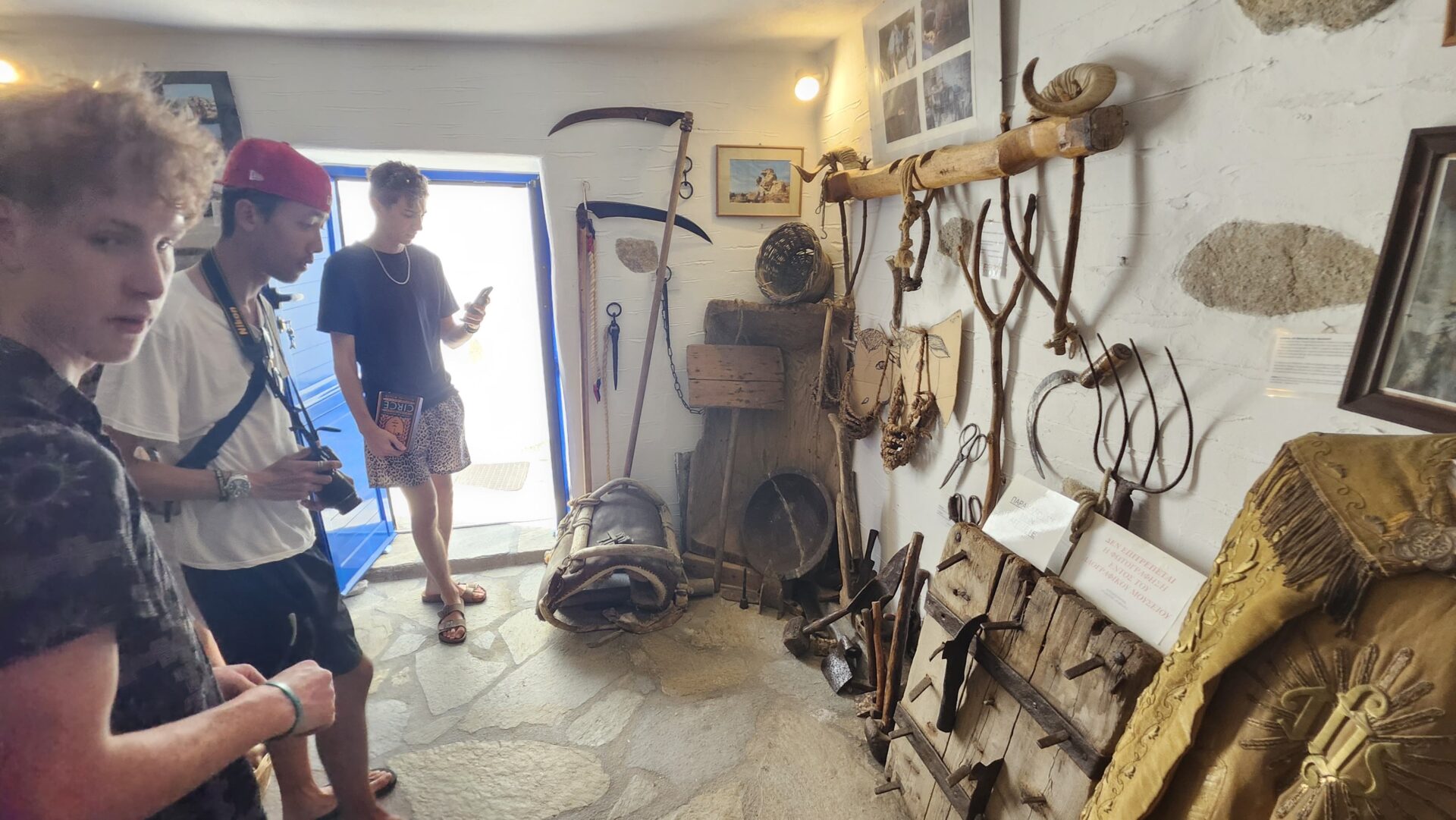 The day began with a short bus ride to visit our first stop, Volax, which had a very unique landscape. As far as the eye could see, there were large boulders, called volakes – it truly looked like Mars on Earth. Volax, the very small town tucked behind the hills of Tinos, was definitely a highlight as we got to climb the massive boulders and take pictures with some of the other grade 12 students in photography class. I spoke with Simon who said his favourite part of the day was, “Getting to see this ancient town, and going with the fellas to take a bunch of nice photos and climb the boulders to sight see.” As we continued to explore, the boulders seemed to be whispering stories from ancient times as we climbed them. The odd shapes and sizes brought out a dreamlike landscape. It was amazing to experience a landscape like that because only Volax and Mexico have the boulder formation, which we learned was probably formed from volcanic explosions.