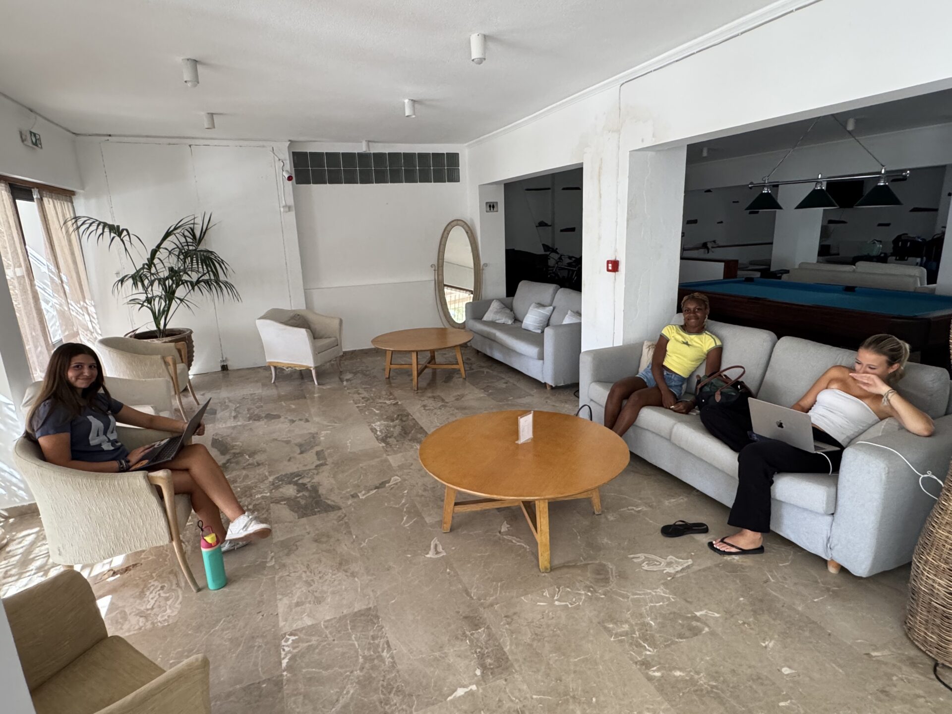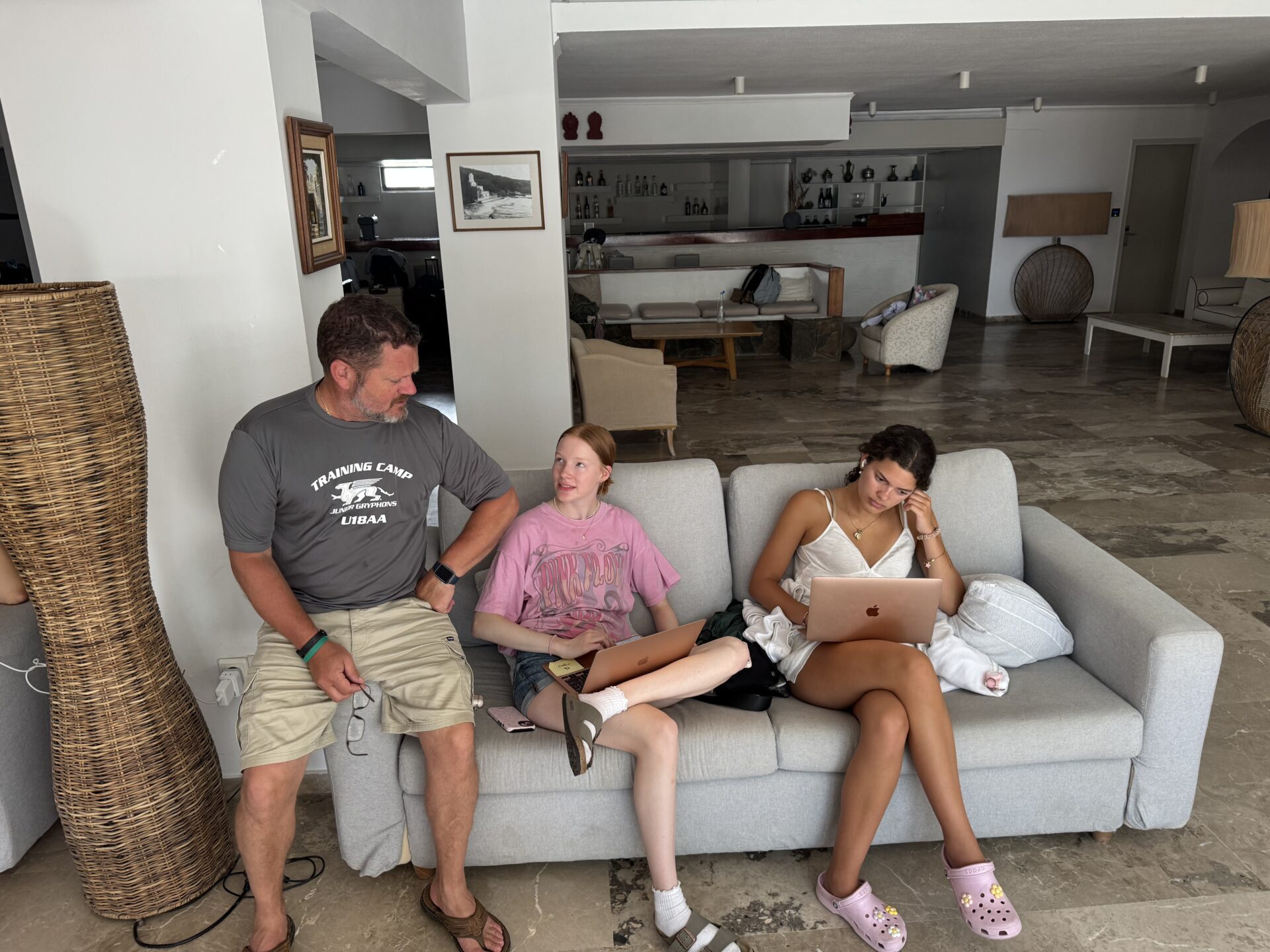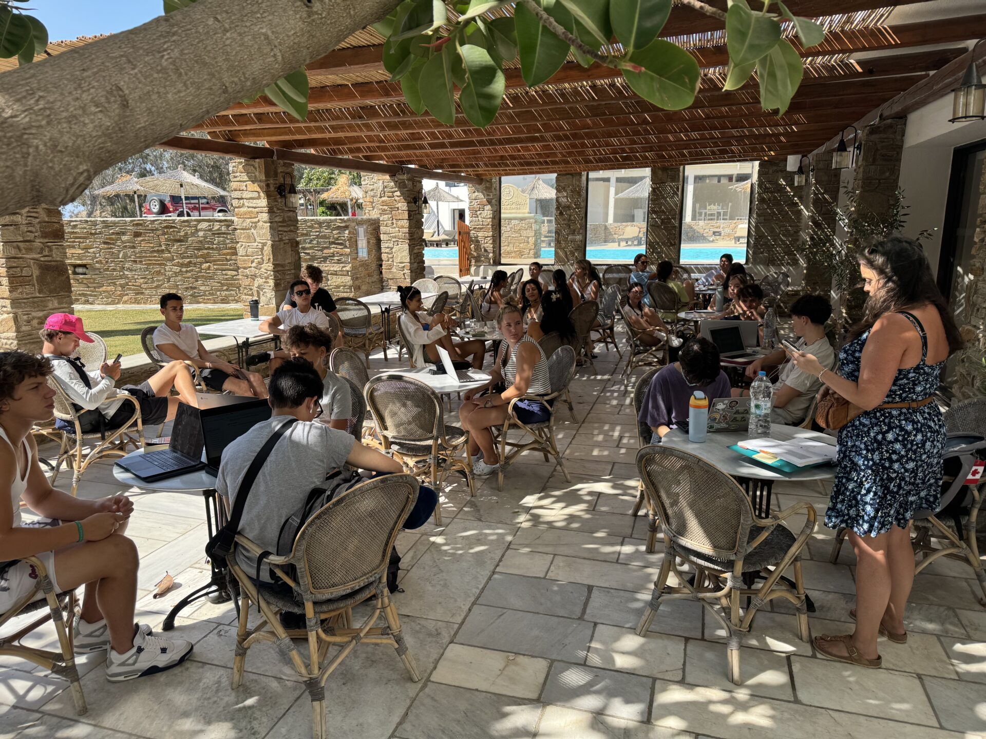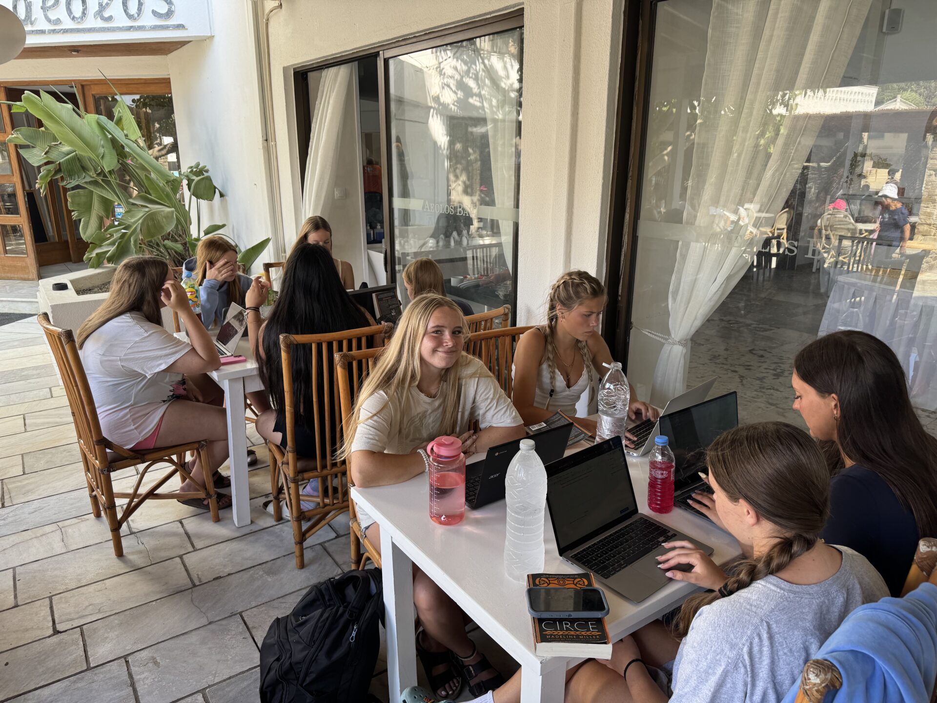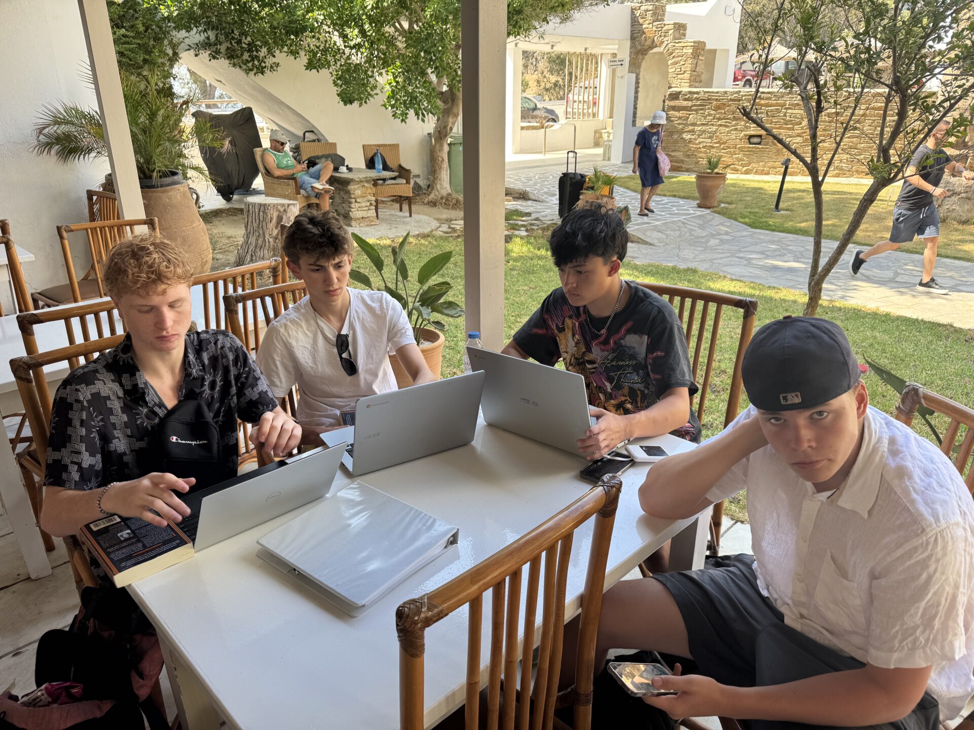 The day started quietly, sitting in an outdoor classroom space. The air was warm, carrying a faint salty smell from the sea nearby. This morning, we went over the structure of an essay: how to make a hook and introduction pull someone in, how to keep body paragraphs connected, and how to end strong. Then Ms. Hrvatin sent us to work independently in the lobby. We all got comfortable and started writing while others read. The steady tapping of laptop keys and the sound of pages turning as people tried to finish the book made the lobby feel calm and focused.