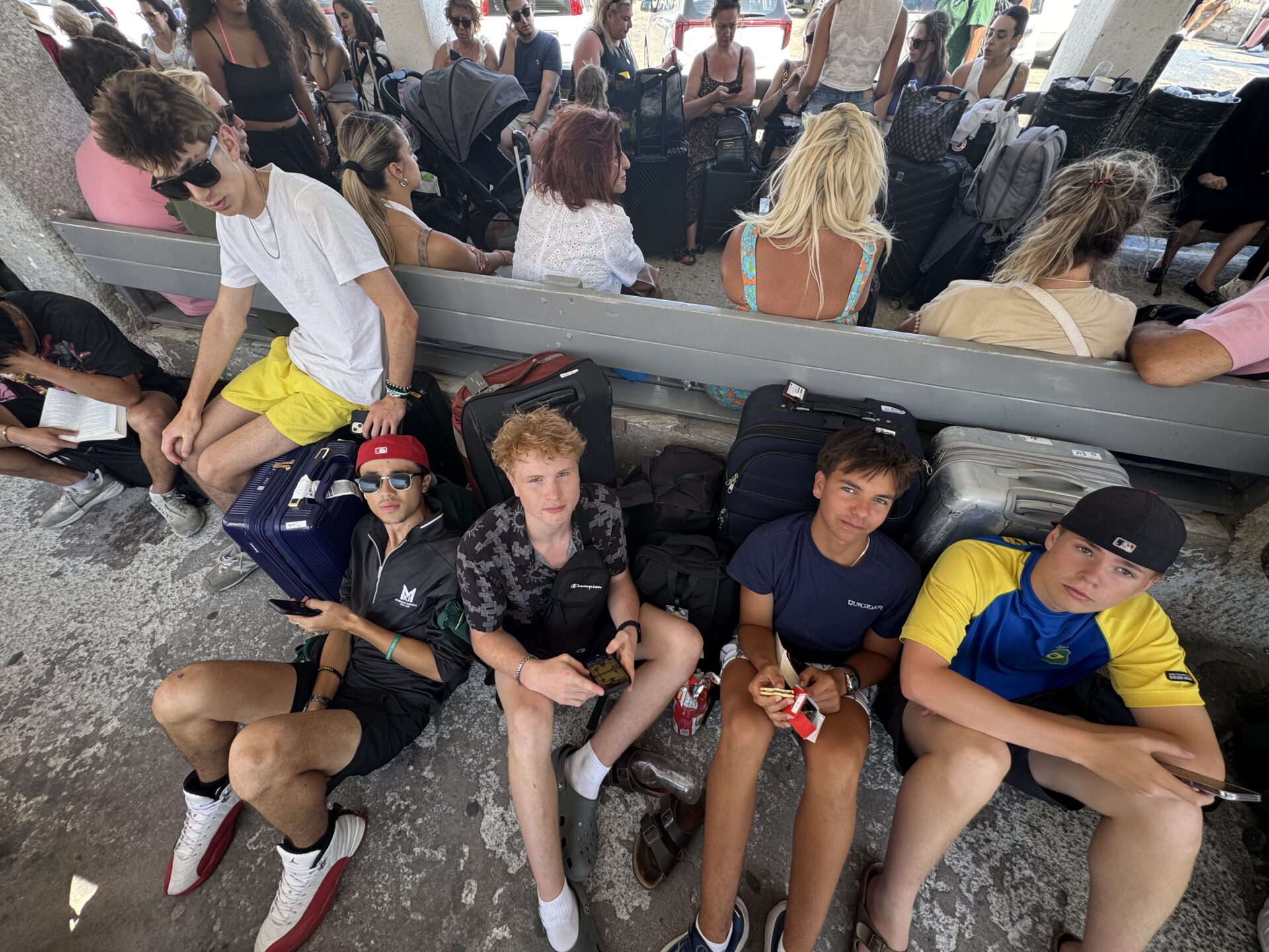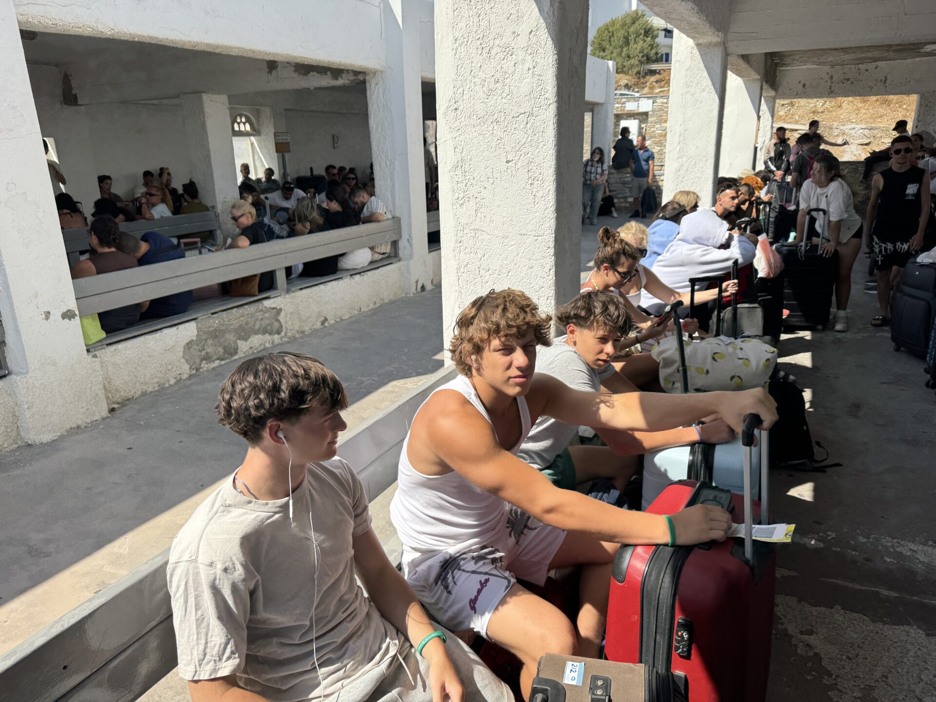 After lunch the reality hit. We finally had a ferry to catch. The bus ride to the port was short, but the heat made it feel longer. The water sparkled in the sun, fishing boats bobbing lazily, while the constant chatter of people waiting for ferries filled the air with a restless energy. Our ferry was about an hour late, so we sat on our bags and waited. Some of us dozed off, trying to ignore the growing impatience. The wind whipped my hair into my face, salty and sharp, and the air smelled like a strange mix of sea salt and diesel fumes. The longer we waited, the more my excitement turned into that tired, impatient “let’s just get moving already” feeling.