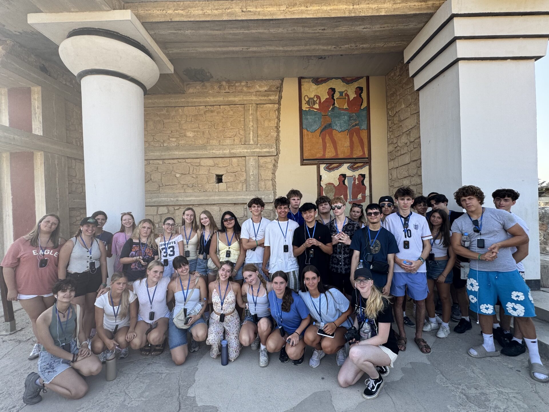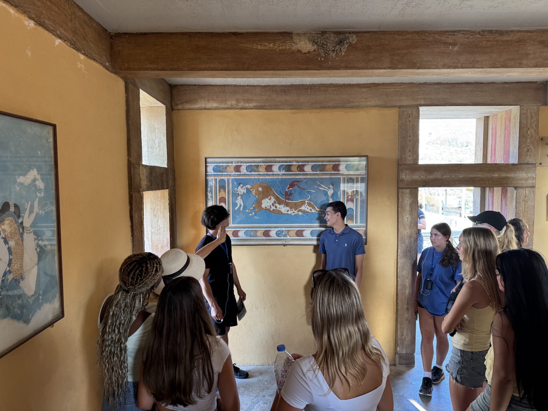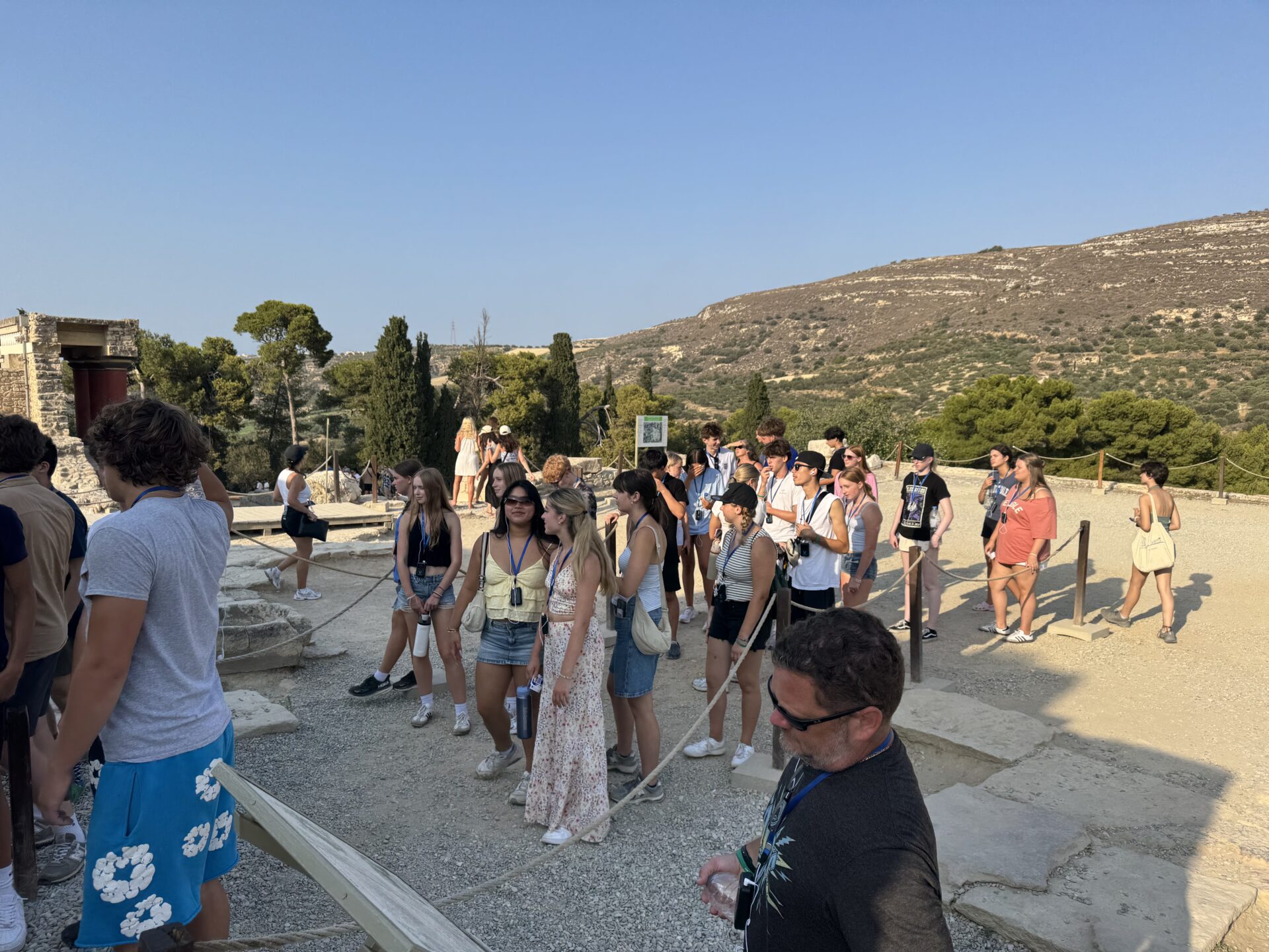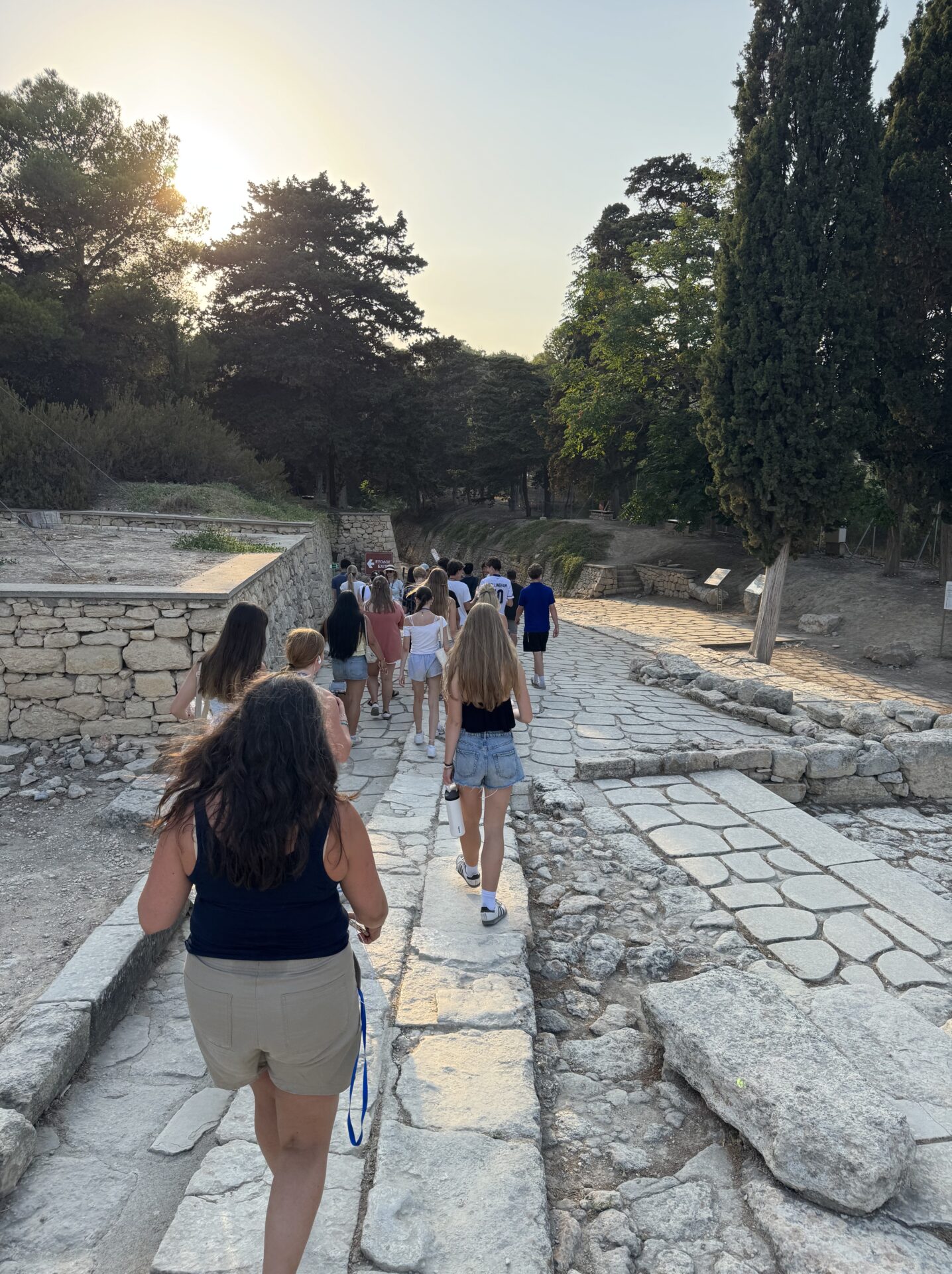 After a bit more shopping, we climbed back onto the bus and set off for Knossos, the oldest European capital and a historic landmark. There, we met with our tour guide, Maria, who walked us through the ruins of the palace, bringing its stories to life with each step. Walking into the ruins, knowing the walls had stood for thousands of years, was nothing short of breathtaking. It’s incredible to think about how much we’ve uncovered about the past, yet how many mysteries still remain. Within the palace walls, countless stories have been created and taken place, but none more famous than the legend of the Minotaur and the labyrinth where he was said to be trapped, a tale our guide shared in detail. We learned about the Minoan people, their unique culture, and the way they lived, even pausing to admire ancient tapestries that gave us a glimpse of how they looked in their own time. While everyone learned a lot of information, the history students listened with particular focus, knowing they’d be writing a journal entry on Knossos as part of their work for the day. When it was time to leave, we stepped onto the oldest road in Europe. Walking along it left a quiet, lingering awe, knowing that for thousands of years, both everyday people and great historical figures had set foot on those same stones.