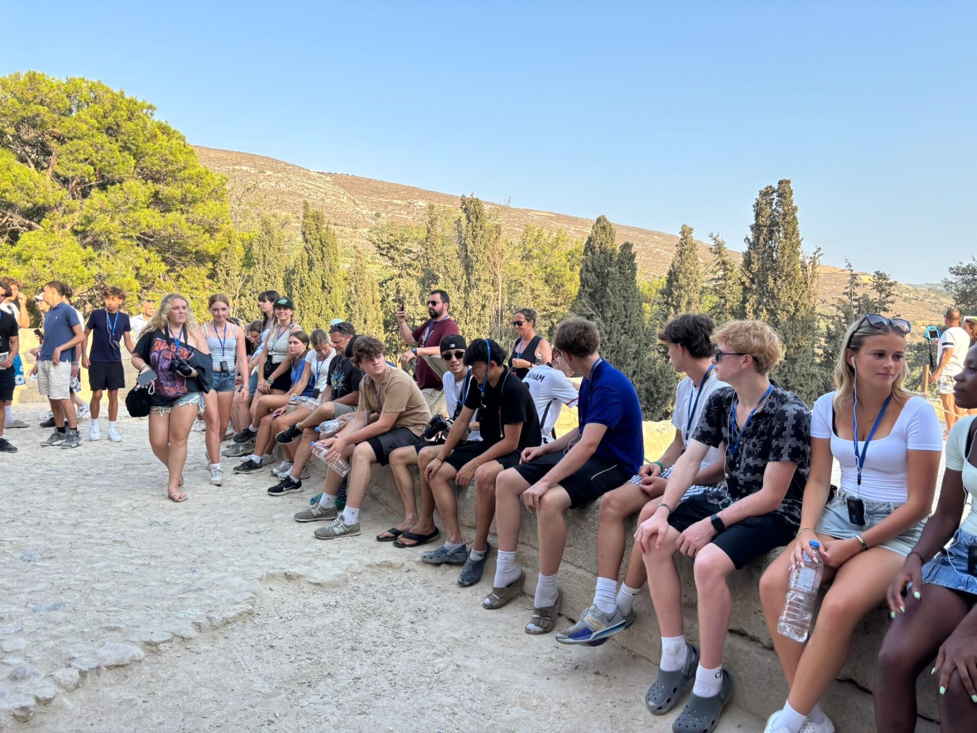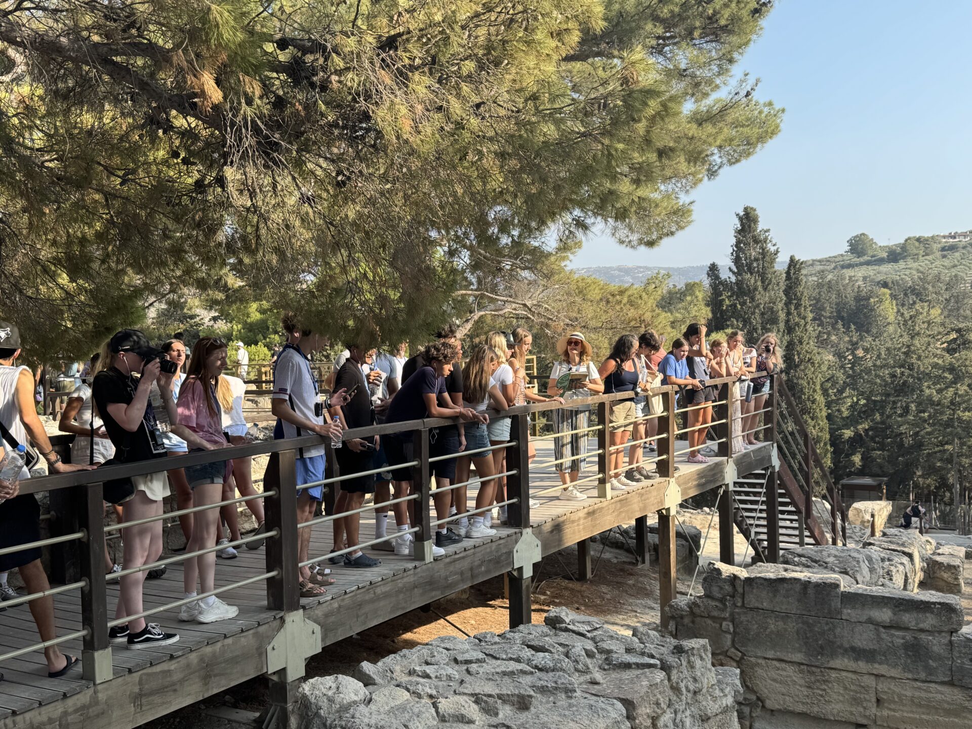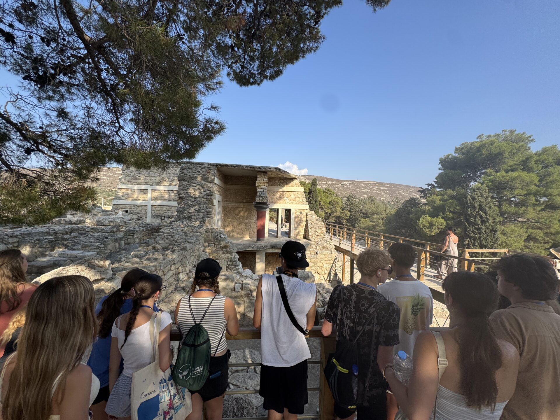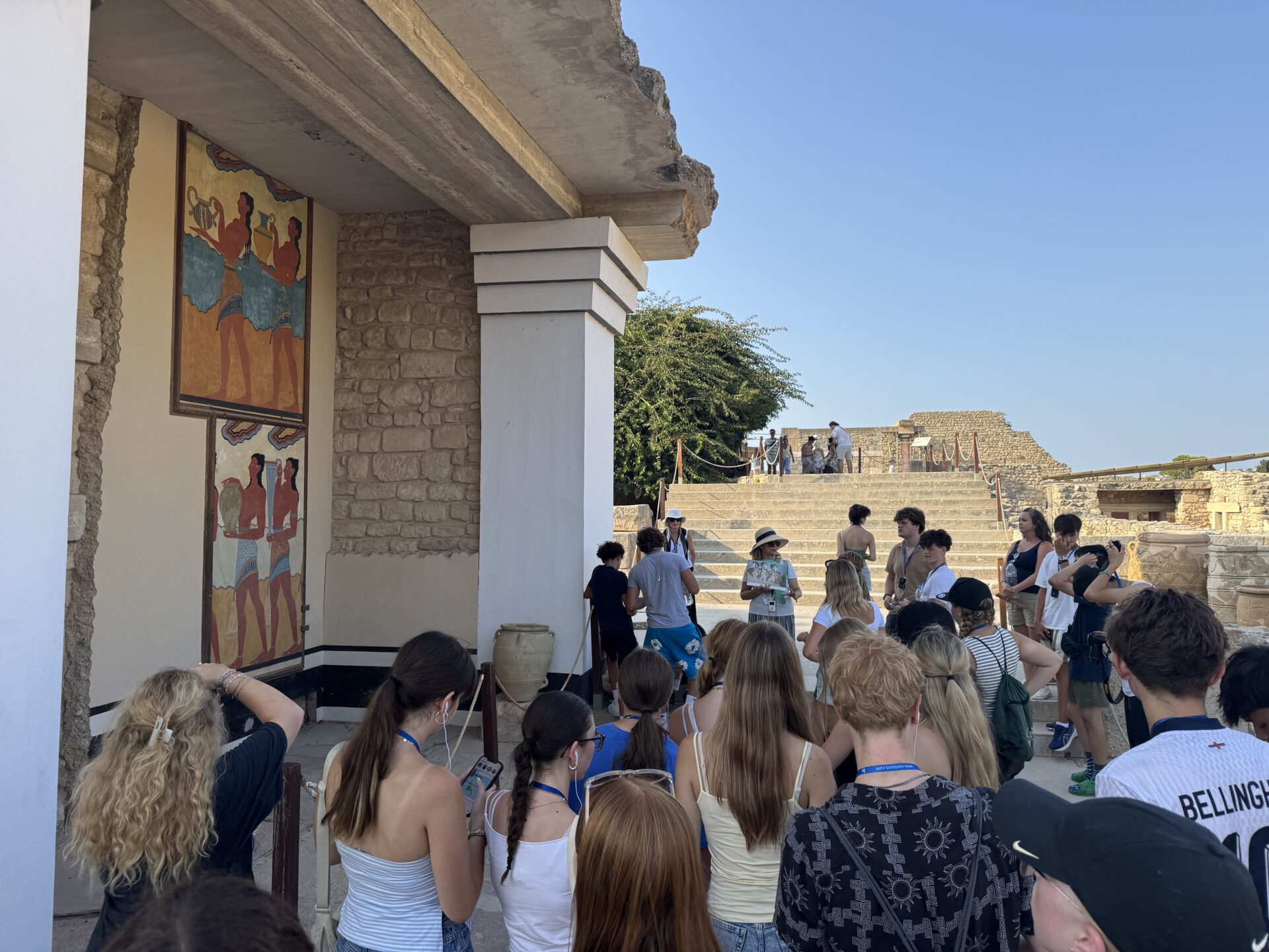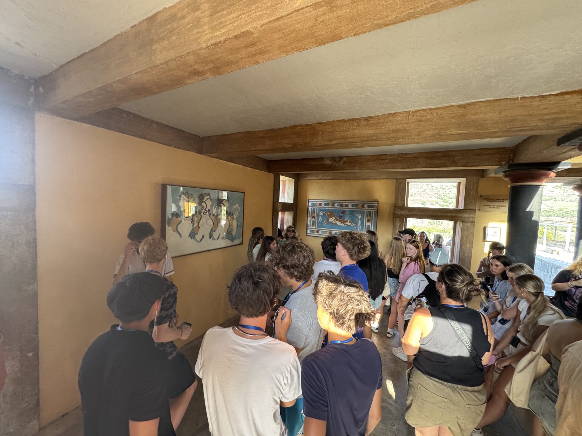 After a bit more shopping, we climbed back onto the bus and set off for Knossos, the oldest European capital and a historic landmark. There, we met with our tour guide, Maria, who walked us through the ruins of the palace, bringing its stories to life with each step. Walking into the ruins, knowing the walls had stood for thousands of years, was nothing short of breathtaking. It’s incredible to think about how much we’ve uncovered about the past, yet how many mysteries still remain. Within the palace walls, countless stories have been created and taken place, but none more famous than the legend of the Minotaur and the labyrinth where he was said to be trapped, a tale our guide shared in detail. We learned about the Minoan people, their unique culture, and the way they lived, even pausing to admire ancient tapestries that gave us a glimpse of how they looked in their own time. While everyone learned a lot of information, the history students listened with particular focus, knowing they’d be writing a journal entry on Knossos as part of their work for the day. When it was time to leave, we stepped onto the oldest road in Europe. Walking along it left a quiet, lingering awe, knowing that for thousands of years, both everyday people and great historical figures had set foot on those same stones.