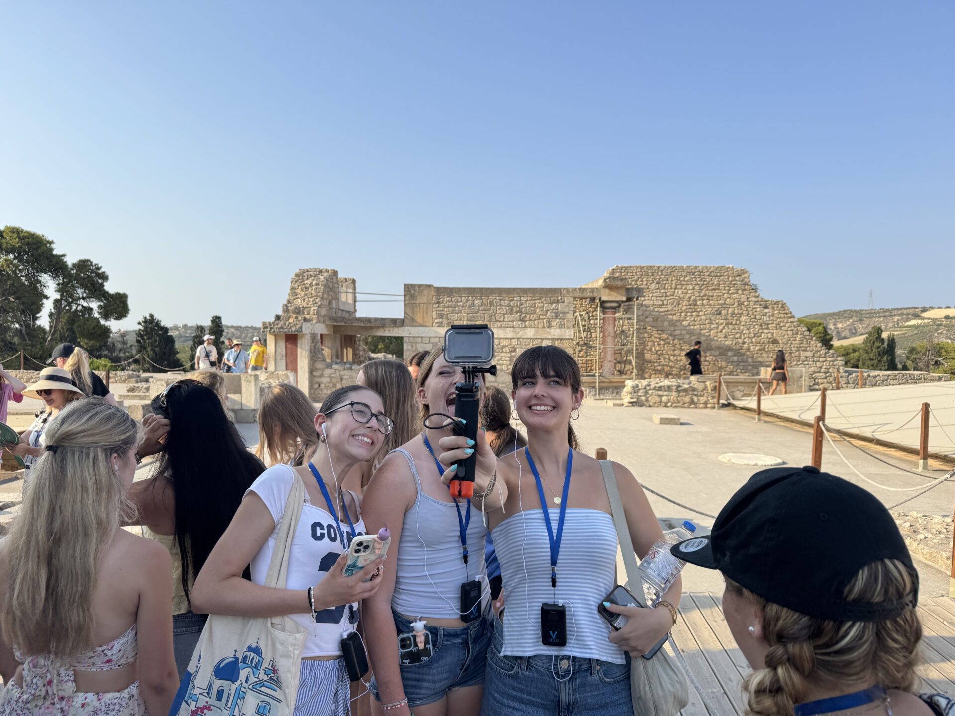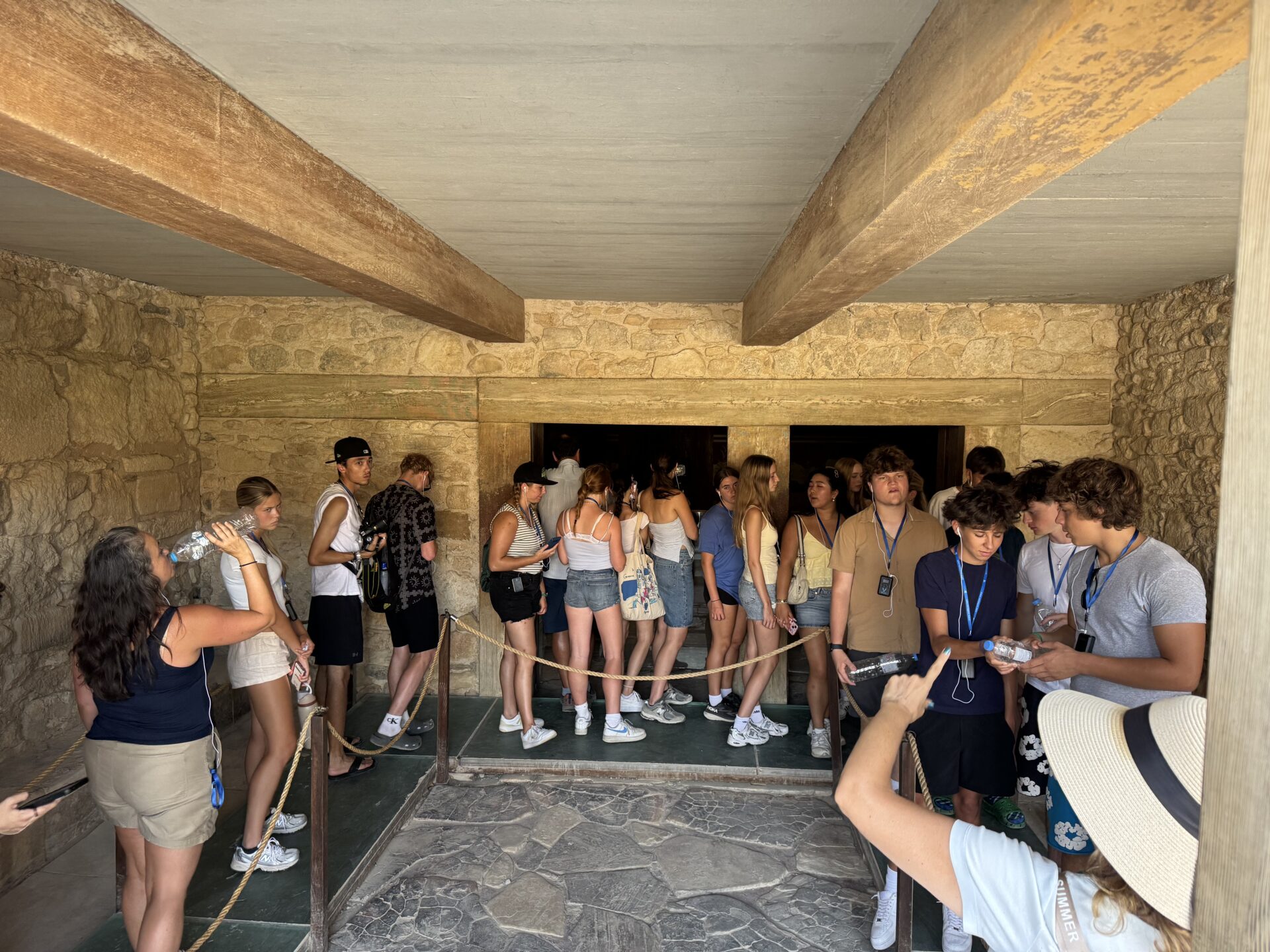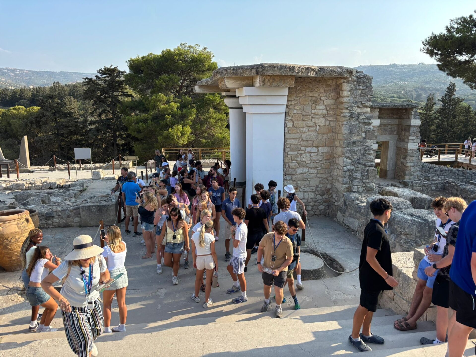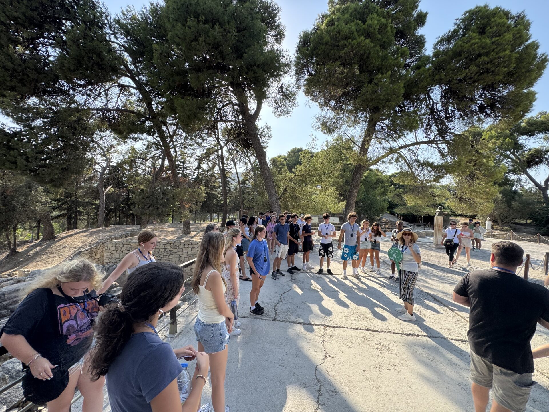 After a bit more shopping, we climbed back onto the bus and set off for Knossos, the oldest European capital and a historic landmark. There, we met with our tour guide, Maria, who walked us through the ruins of the palace, bringing its stories to life with each step. Walking into the ruins, knowing the walls had stood for thousands of years, was nothing short of breathtaking. It’s incredible to think about how much we’ve uncovered about the past, yet how many mysteries still remain. Within the palace walls, countless stories have been created and taken place, but none more famous than the legend of the Minotaur and the labyrinth where he was said to be trapped, a tale our guide shared in detail. We learned about the Minoan people, their unique culture, and the way they lived, even pausing to admire ancient tapestries that gave us a glimpse of how they looked in their own time. While everyone learned a lot of information, the history students listened with particular focus, knowing they’d be writing a journal entry on Knossos as part of their work for the day. When it was time to leave, we stepped onto the oldest road in Europe. Walking along it left a quiet, lingering awe, knowing that for thousands of years, both everyday people and great historical figures had set foot on those same stones.