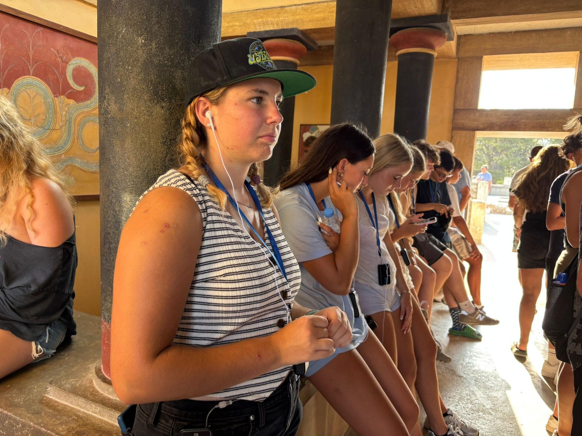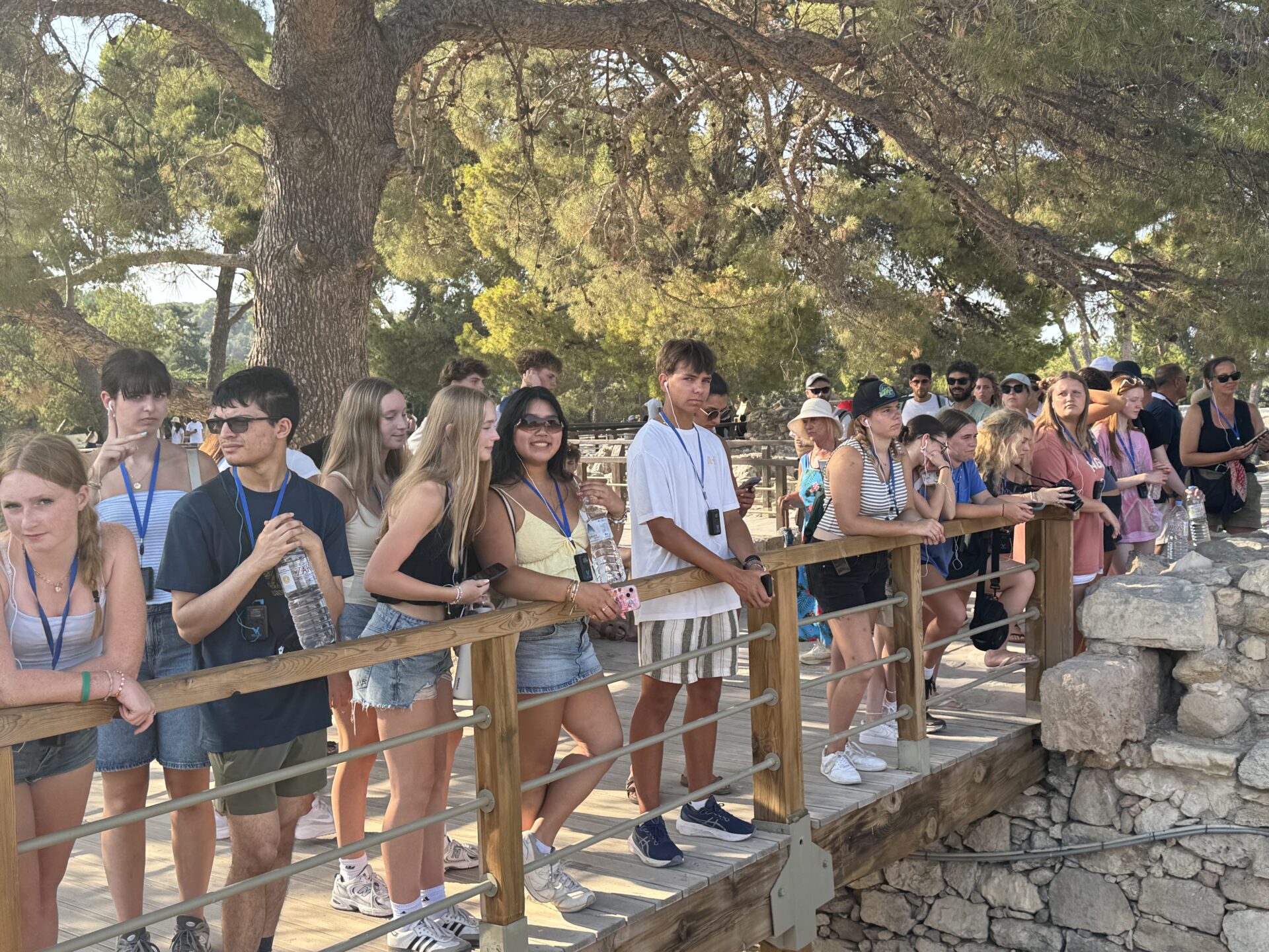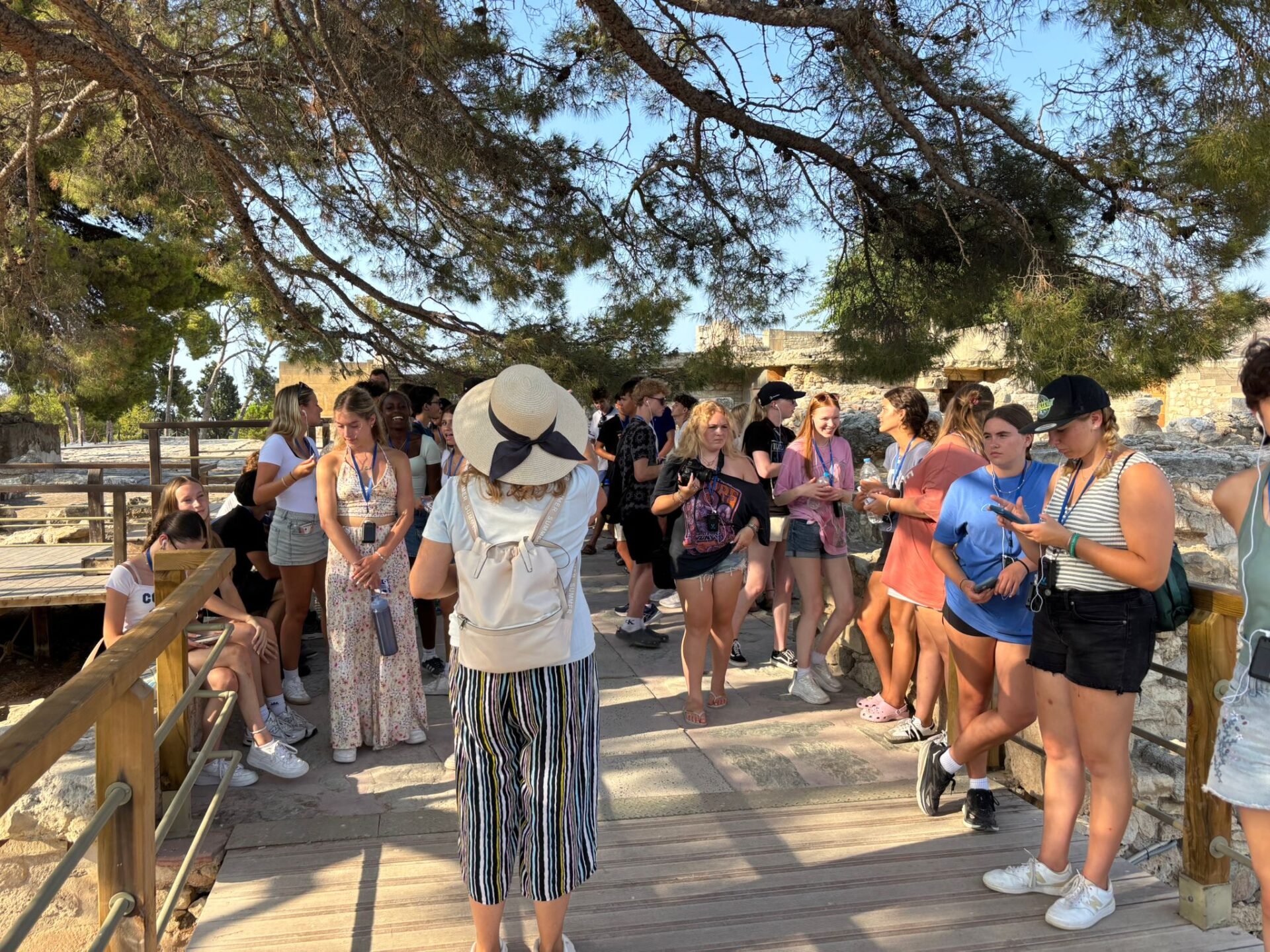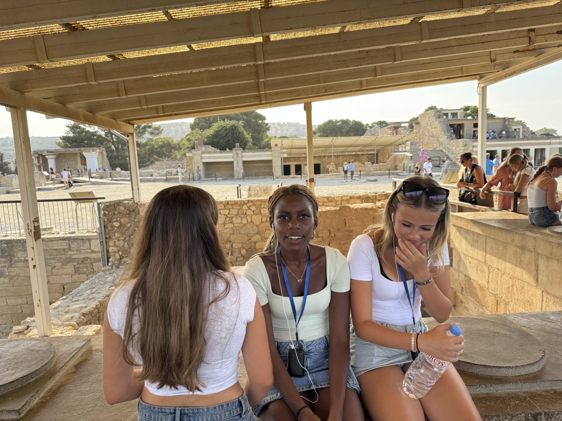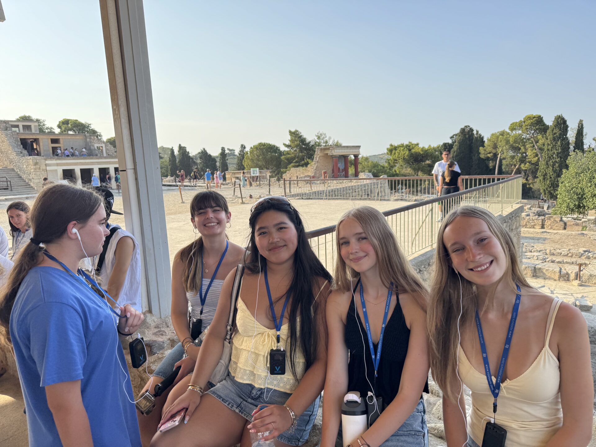 After a bit more shopping, we climbed back onto the bus and set off for Knossos, the oldest European capital and a historic landmark. There, we met with our tour guide, Maria, who walked us through the ruins of the palace, bringing its stories to life with each step. Walking into the ruins, knowing the walls had stood for thousands of years, was nothing short of breathtaking. It’s incredible to think about how much we’ve uncovered about the past, yet how many mysteries still remain. Within the palace walls, countless stories have been created and taken place, but none more famous than the legend of the Minotaur and the labyrinth where he was said to be trapped, a tale our guide shared in detail. We learned about the Minoan people, their unique culture, and the way they lived, even pausing to admire ancient tapestries that gave us a glimpse of how they looked in their own time. While everyone learned a lot of information, the history students listened with particular focus, knowing they’d be writing a journal entry on Knossos as part of their work for the day. When it was time to leave, we stepped onto the oldest road in Europe. Walking along it left a quiet, lingering awe, knowing that for thousands of years, both everyday people and great historical figures had set foot on those same stones.