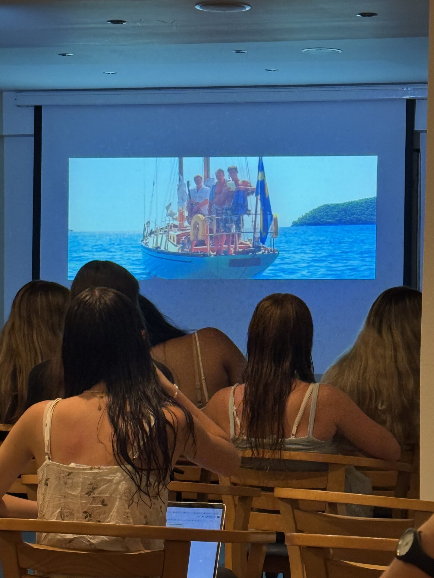 We climbed back onto the bus for the final leg of the day, the ride back to the hotel. By then, exhaustion had settled in, leaving only the soft hum of music and the occasional sleepy yawn to fill the space. Dinner came and went quickly. The food was good, though it didn’t quite meet the expectations set by the other delicious meals we’d enjoyed earlier in the program. Afterward, most of the students stayed in for a Mamma Mia movie night, a perfect choice in my opinion, given our destination. The atmosphere was warm and joyful. Some students sang along, while others watched quietly, content to cherish the moment. In just three short weeks, the people in the room had become like family. The end of the program was approaching fast, and a quiet sadness lingered, as everyone realized that this little paradise wouldn’t last forever. How could school ever be this much fun again? Eventually, the night came to a close as we headed to bed, but a buzz of excitement remained. Tomorrow promised more adventures, like exploring a cave for an optional excursion, parasailing, and tubing. This kept the spirit of the program alive just a little longer.