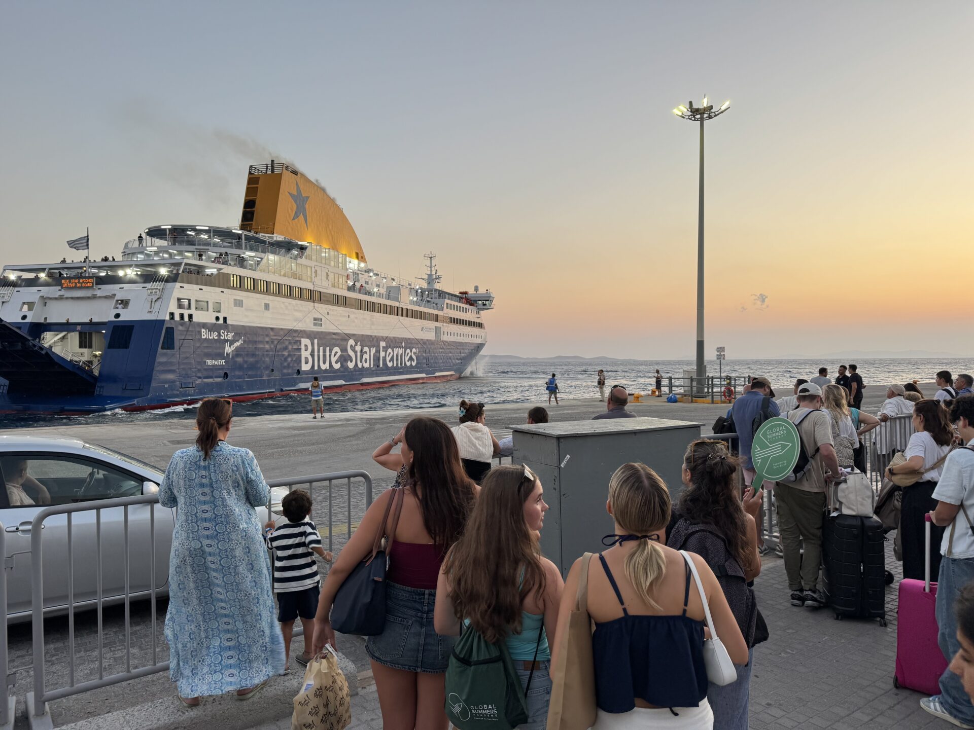 From there, we hopped on the ferry to Mykonos. The ride wasn’t too long, and many of us spent it talking about our plans for the day, taking in the view, and trying to get some schoolwork done. When we finally pulled into Mykonos, we were all super excited and proceeded to board a bus that was waiting there for us. This bus took us from the new port to the old port, where we met our lovely tour guide for the day, Amy!