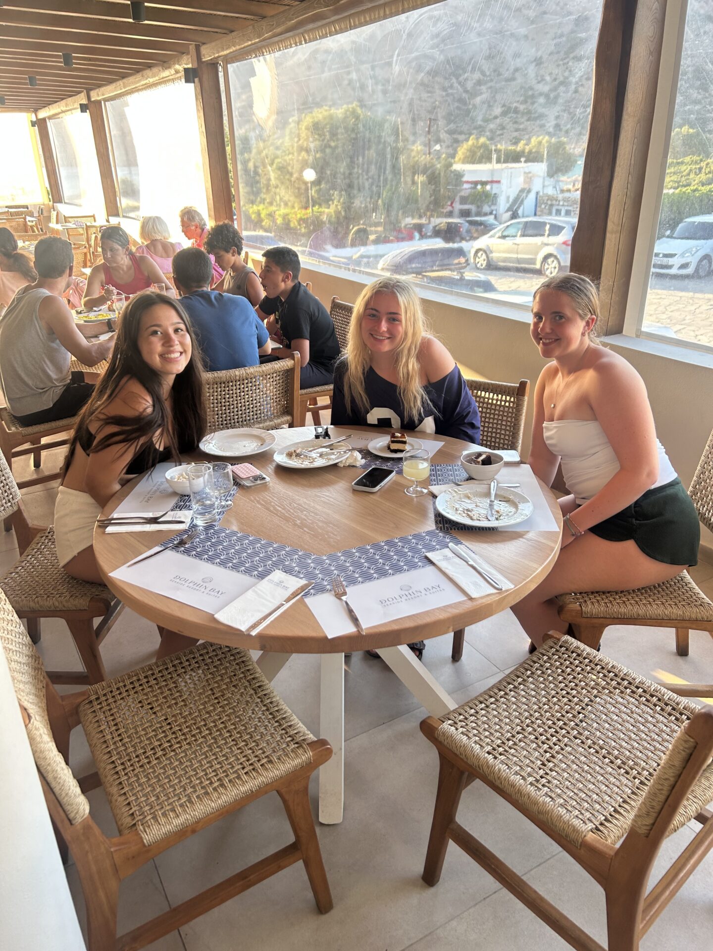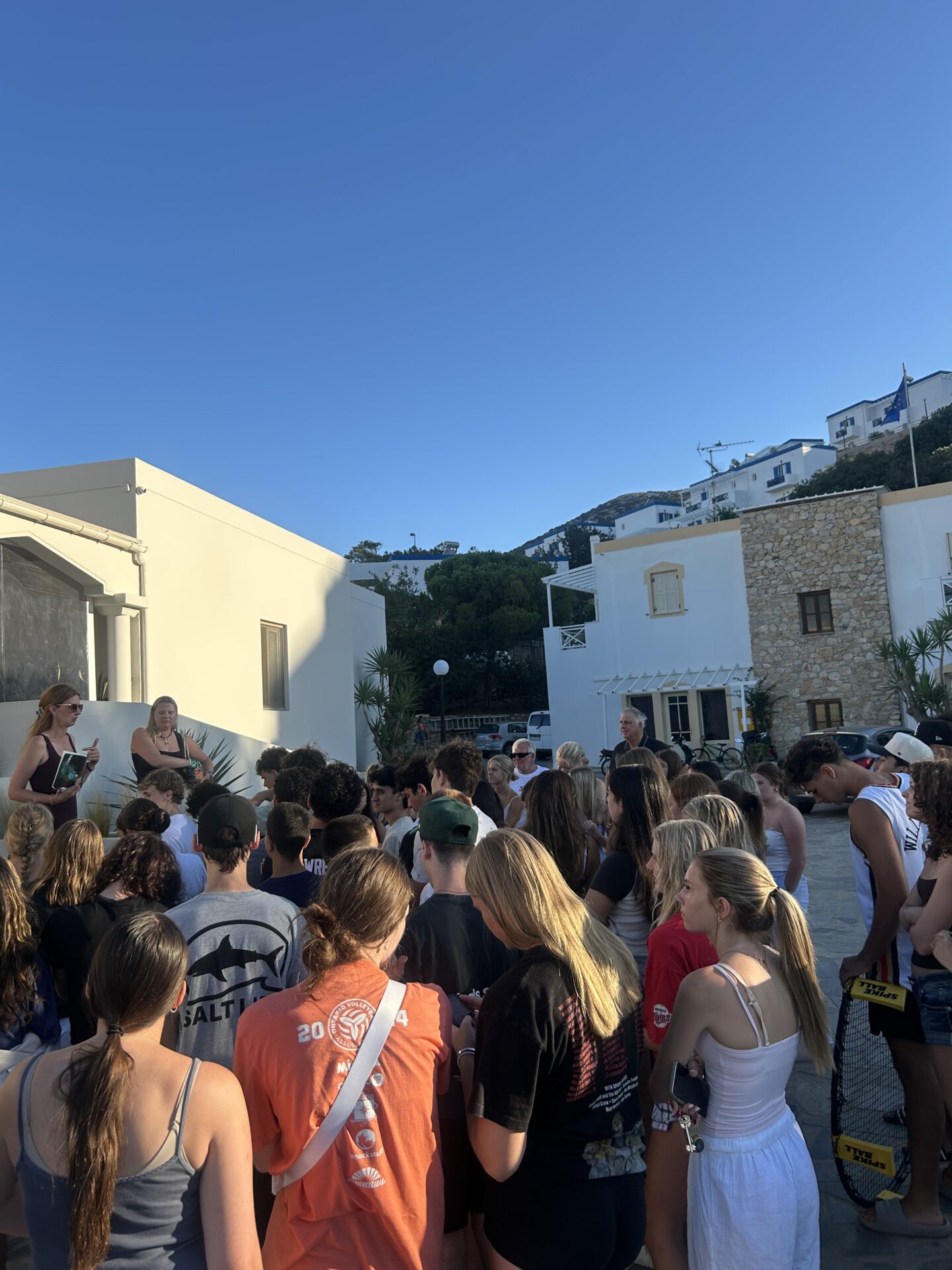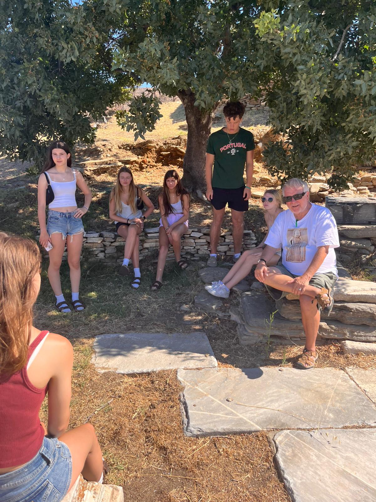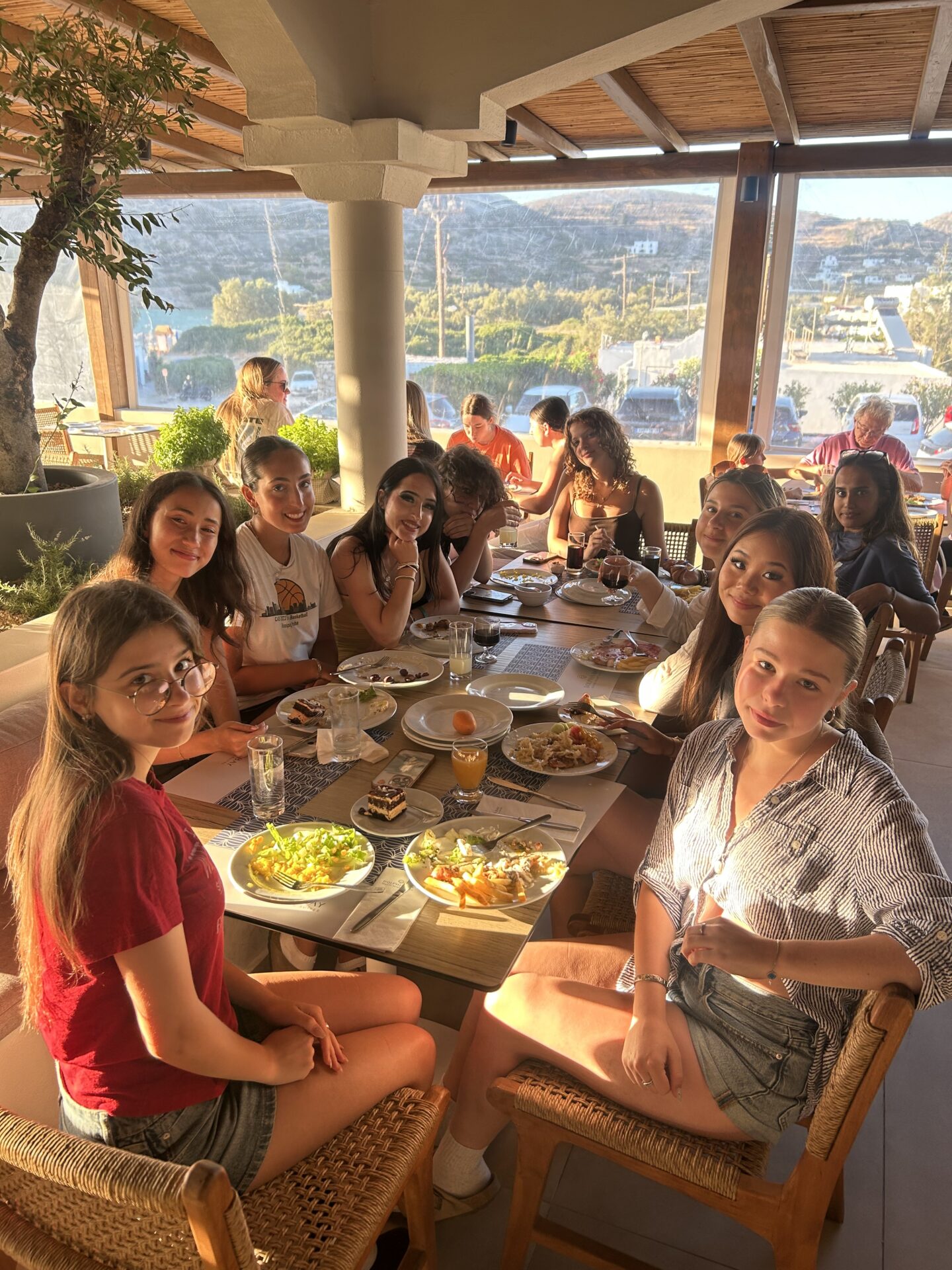 The day started with students waking up for breakfast and getting ready for room checks, excited for their morning classes before we departed. In English, the students were introduced to poetry. At the same time, Dr. Flaherty’s class visited the Archaeological Museum of Tinos, while the biology students explored photosynthesis and anaerobic respiration. After lunch, we headed to the ferry, setting off for the island of Syros. The students were fantastic during our travels, which made for a smooth and easy day. Everyone was thrilled when we arrived at the hotel, where they had time to unpack, freshen up before dinner, and then relax with some free time to explore the area.