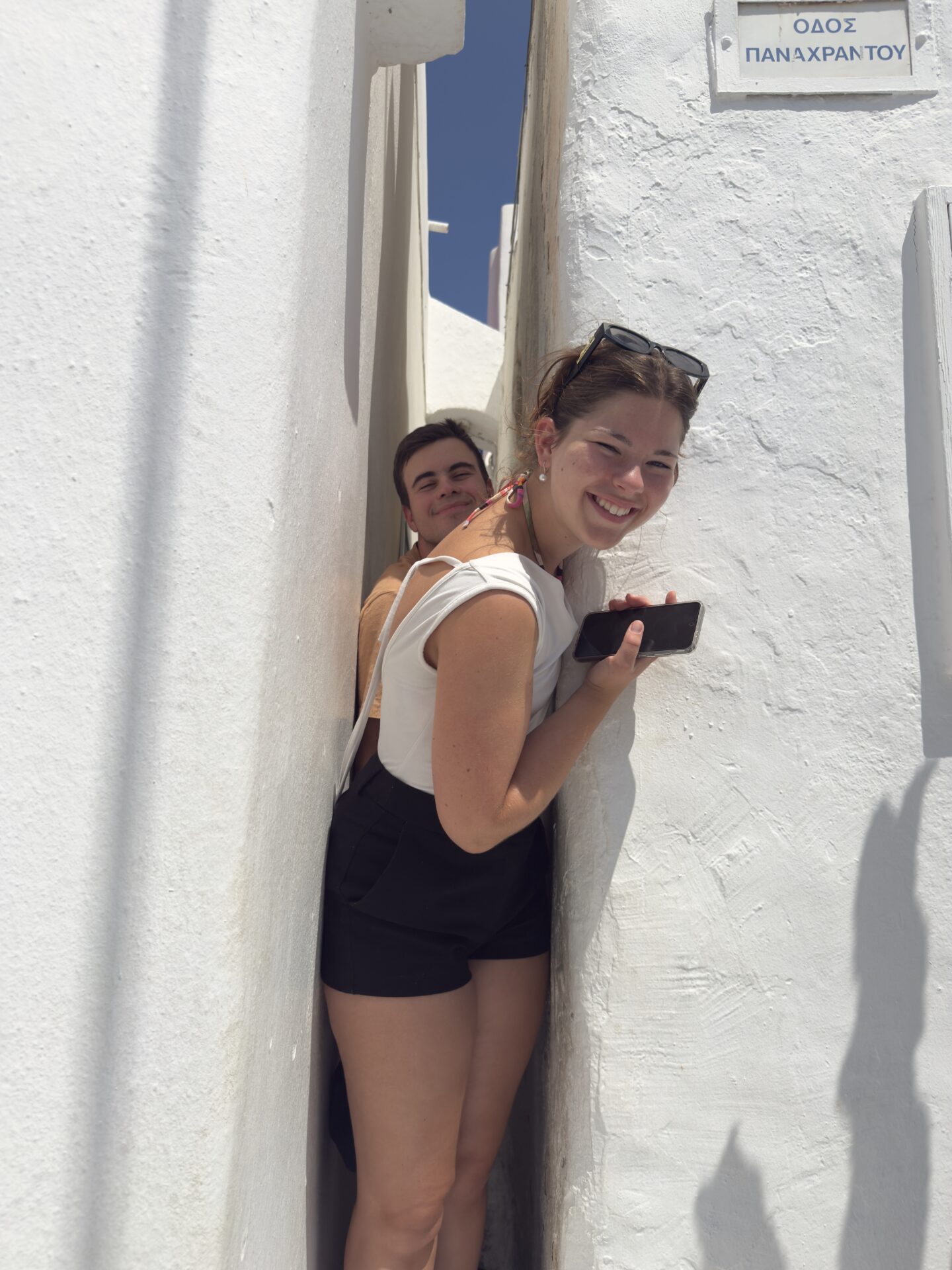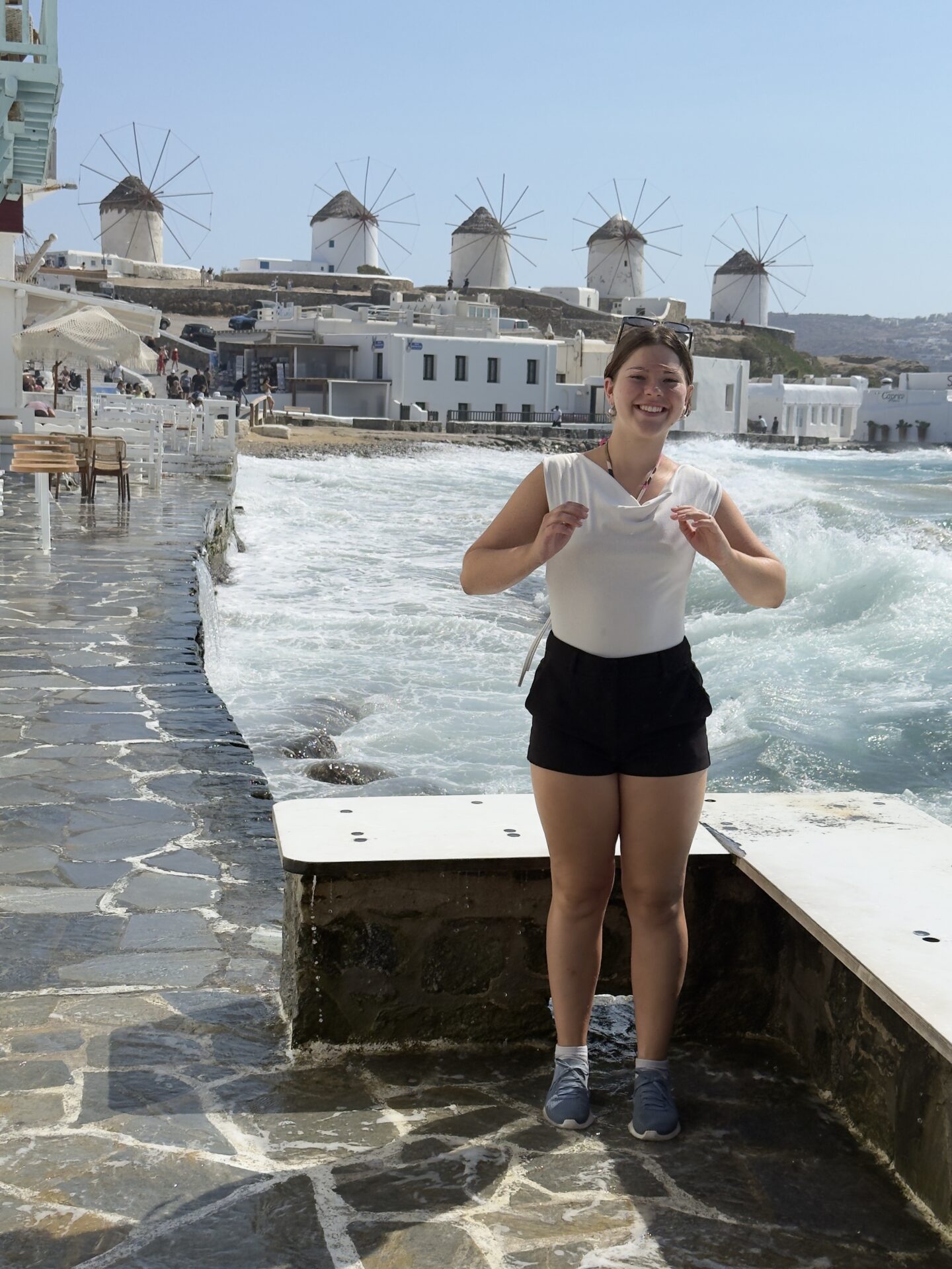 Upon arrival, Mykonos greeted us with its signature charm—and its famous wind! The breeze was playful and persistent, tugging at hats, tousling hair, and adding a touch of drama to every photo op. Students gathered along the coast, eager to capture the legendary windmills, only to be splashed by the sea as waves crashed against the rocks. Laughter echoed as they dodged the spray, turning the moment into a highlight of the day.